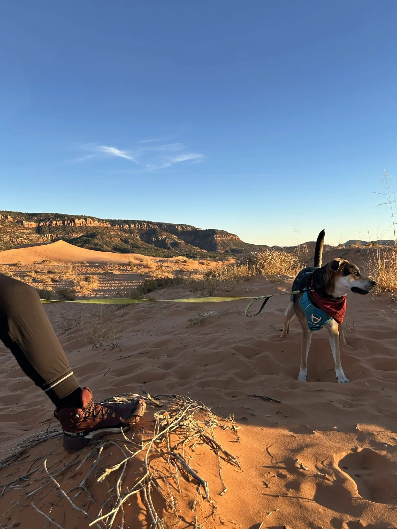 Annie Hiking with Rusty in Coral Pink Sand Dunes State Park Utah! Wearing 360 Reflective Tipping Quarters in Black with High Risk Red Heel and Toe!